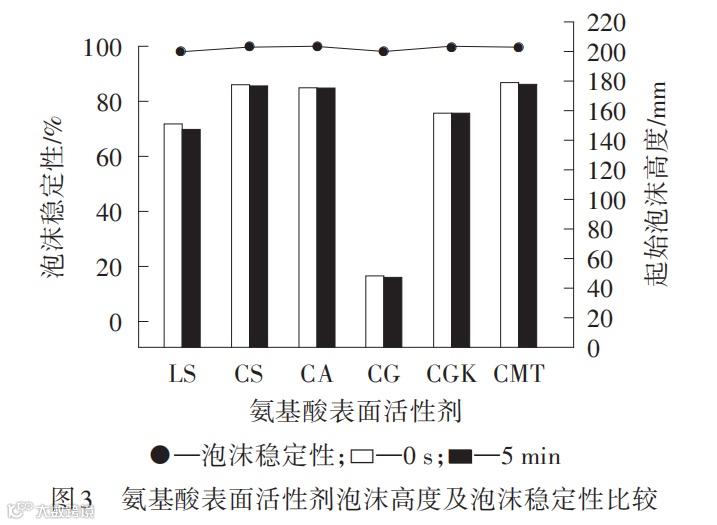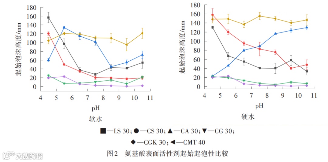 ② 肌氨酸类酸性条件起泡佳,但水硬度影响显著;