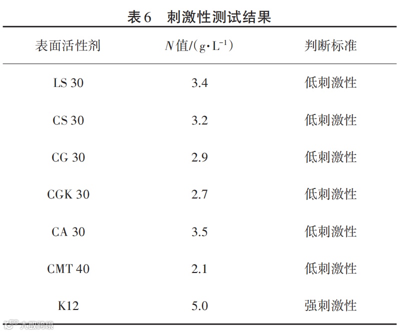 基于玉米醇溶蛋白溶解度的N值测试表明:六种氨基酸表面活性剂均属低刺激性,且甘氨酸类刺激性低于肌氨酸类。