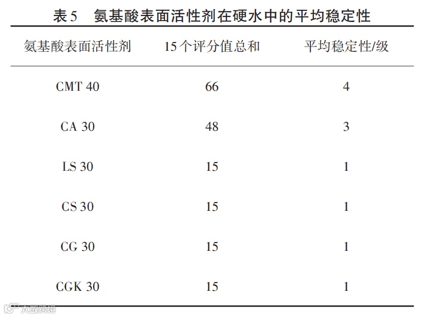 CMT 40抗硬水能力最优,CA 30次之,CG 30/CGK 30/LS 30/CS 30稳定性差。CMT的磺酸基与CA的支链甲基结构增强水溶性,而其他产品易与钙离子生成沉淀。