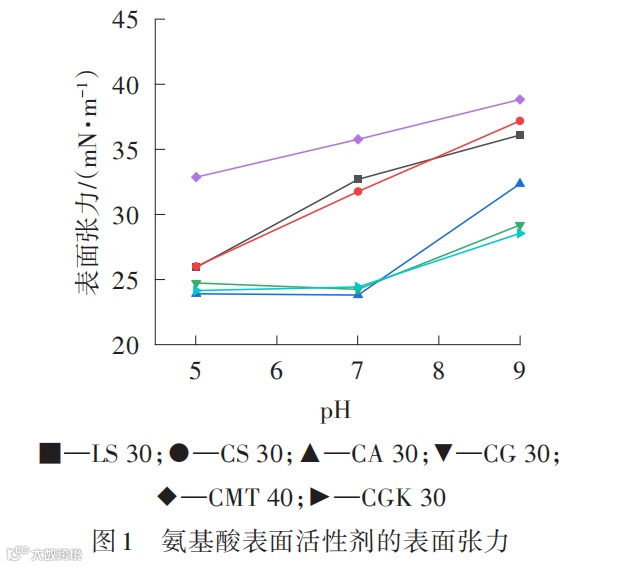 ② 丙氨酸和甘氨酸类产品表面张力较低,牛磺酸钠较高,肌氨酸类居中;