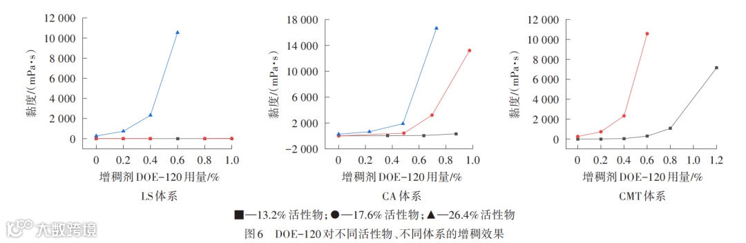 ④ CMT体系不受H+影响,需依赖DOE-120增稠,该增稠剂对CMT效果最佳,CA次之,仅对高浓度LS有效。