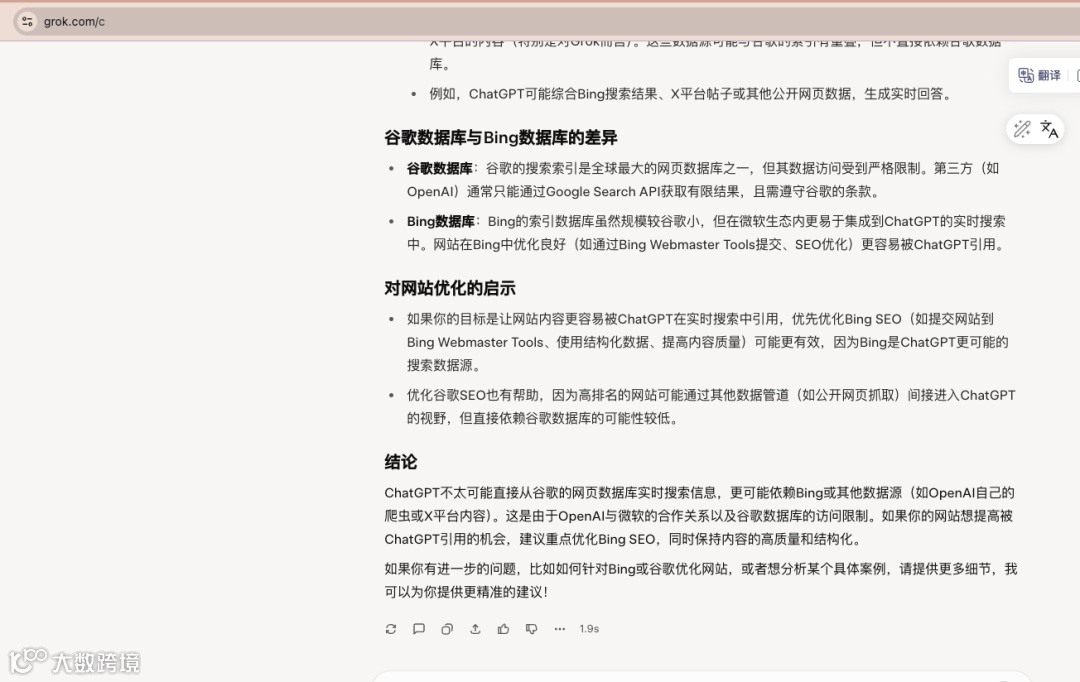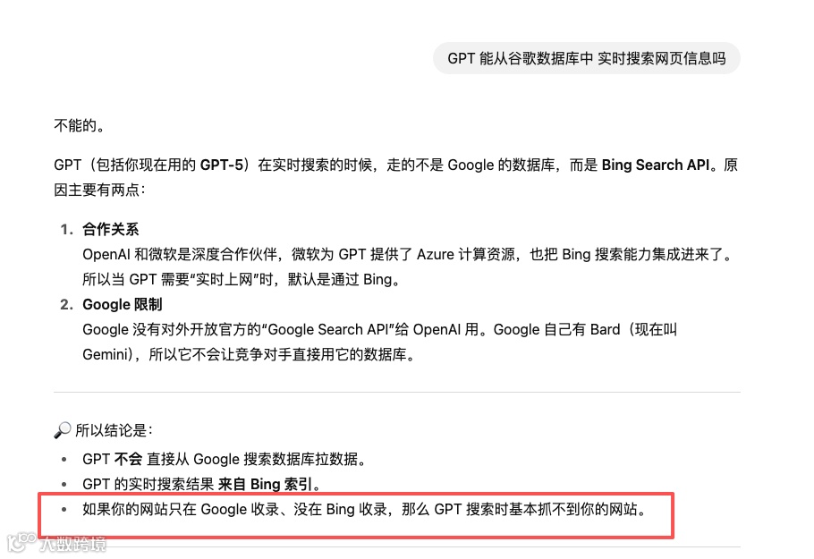 如果一个网站只在 Google 有收录和排名,但 Bing 未收录或排名靠后,那么当 GPT 进行实时搜索时,它几乎不可能抓到你的网站。反之,如果你的网站在 Bing 中收录良好、排名靠前,那么 GPT 在生成回答时就有更大概率引用你的页面。