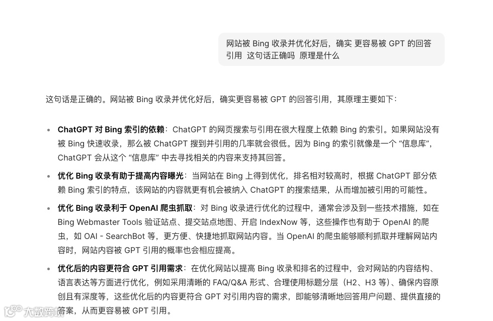 网站被 Bing 收录并优化好后,确实更容易被 GPT 的回答引用,这句话正确吗?原理是什么