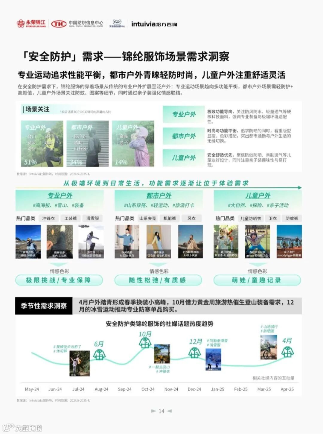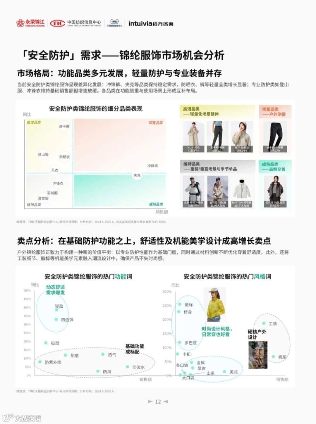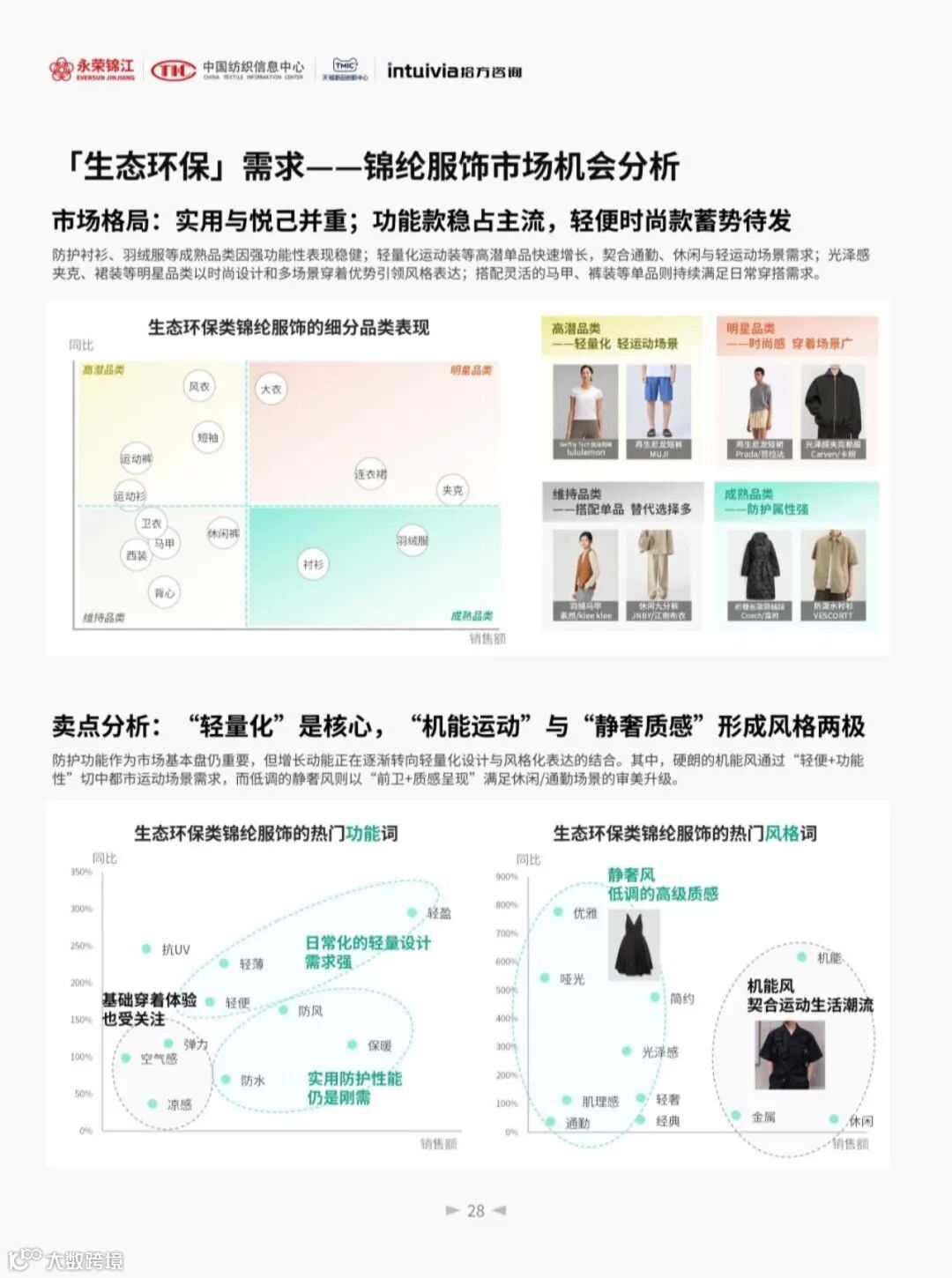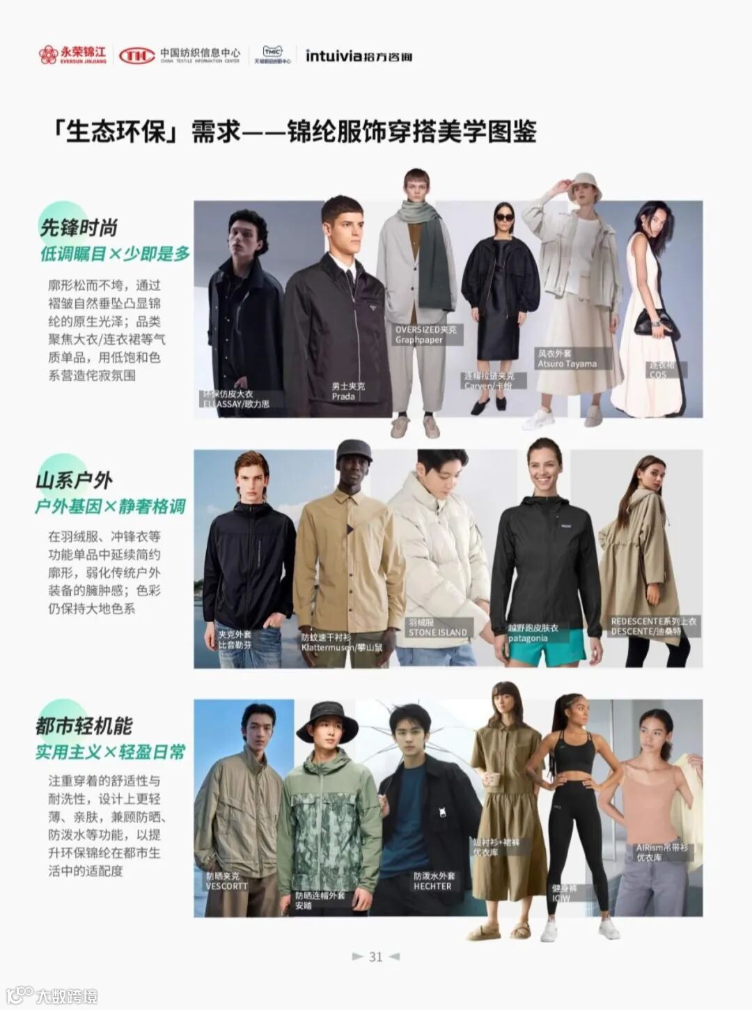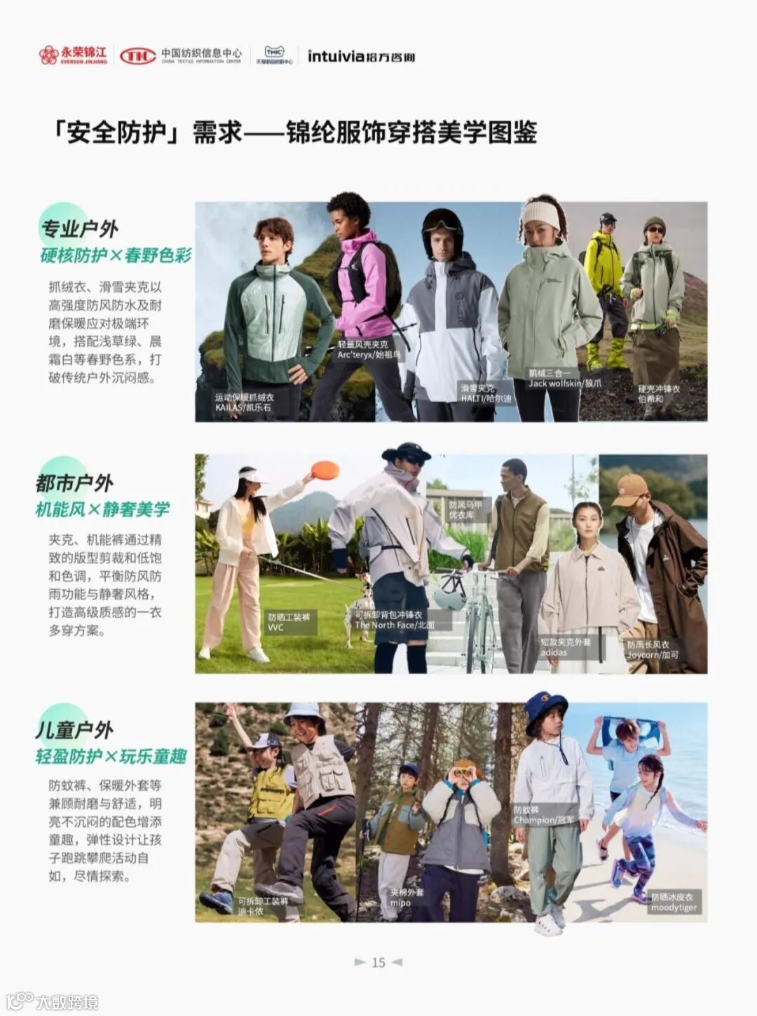 防护衬衫、羽绒服等成熟品类因功能性突出表现稳健;轻量化运动装作为高潜力单品快速增长,契合通勤、休闲及轻运动场景需求;光泽感夹克、裙装等明星产品凭借时尚设计与多场景适配优势引领风格潮流。消费者对环保材质的关注度不断提升,再生锦纶、生物基锦纶等绿色纤维日益受到市场青睐。