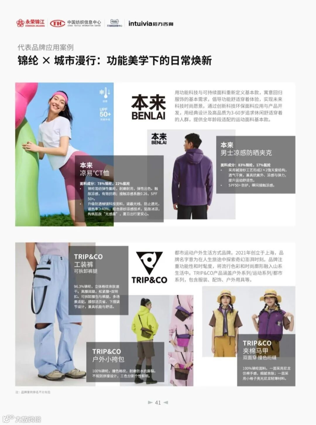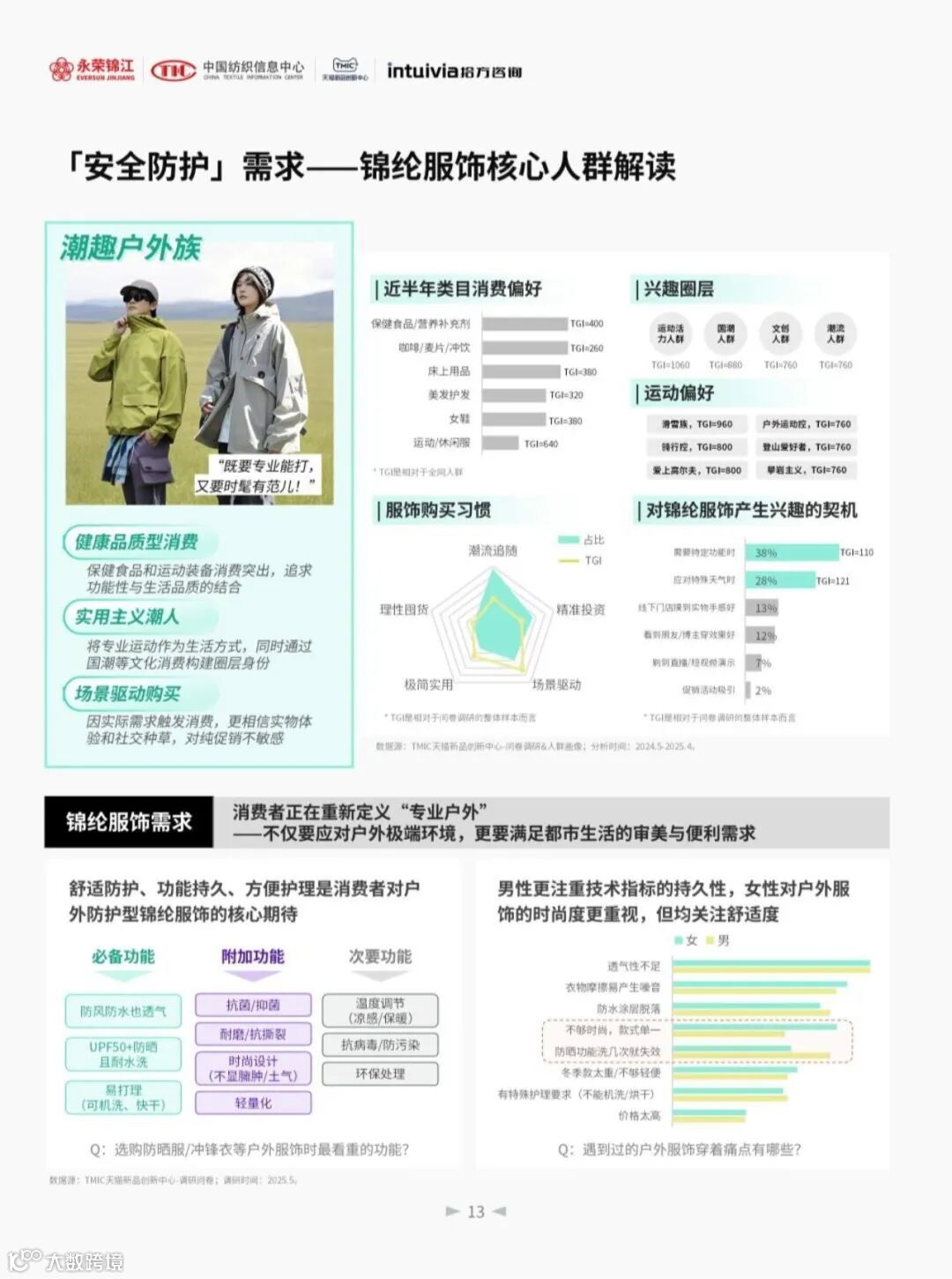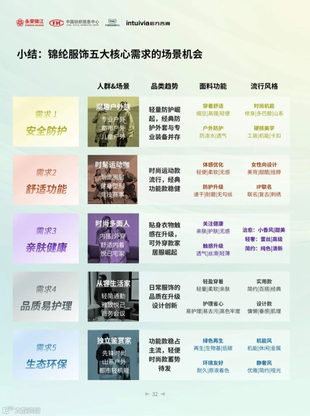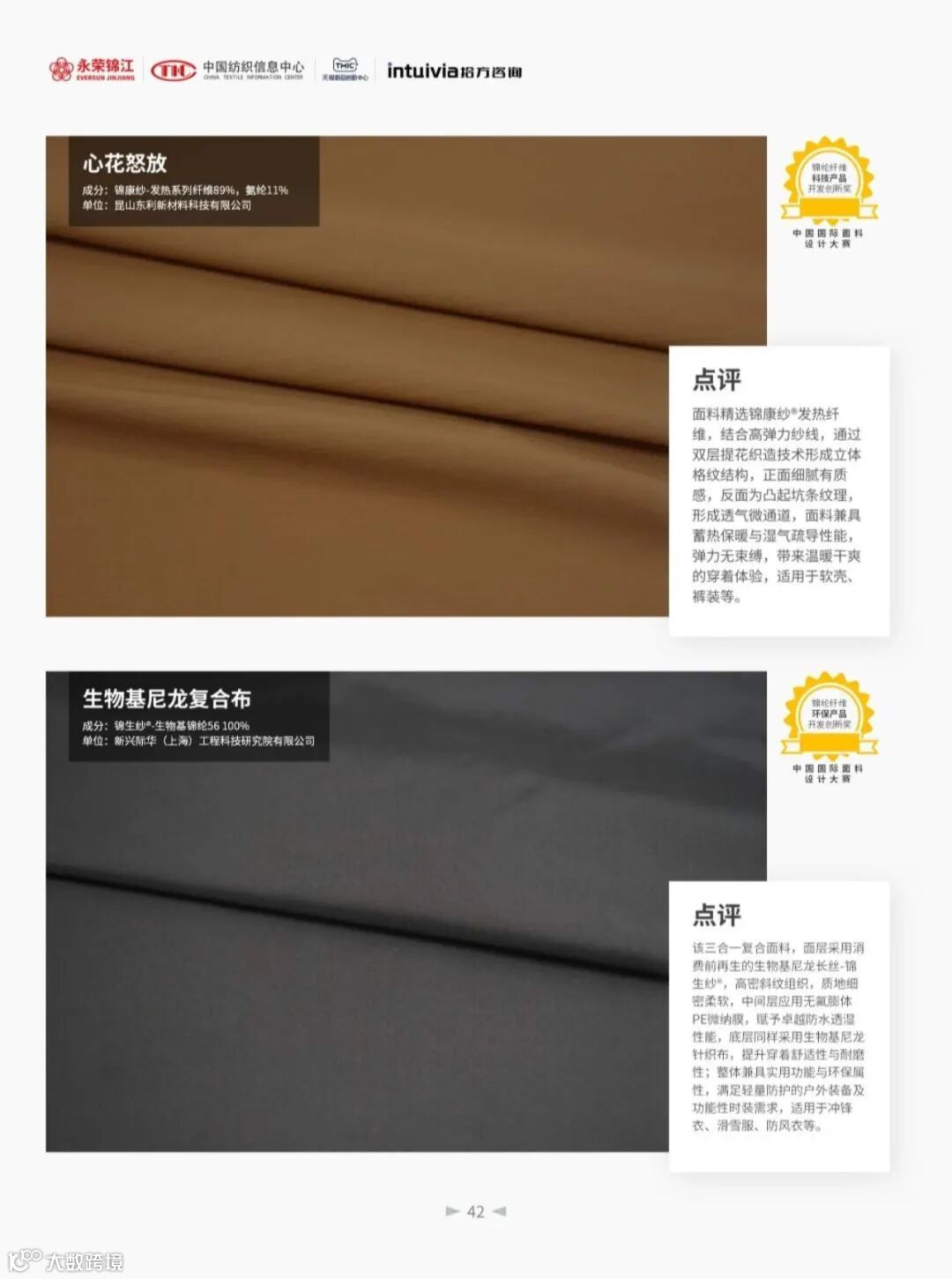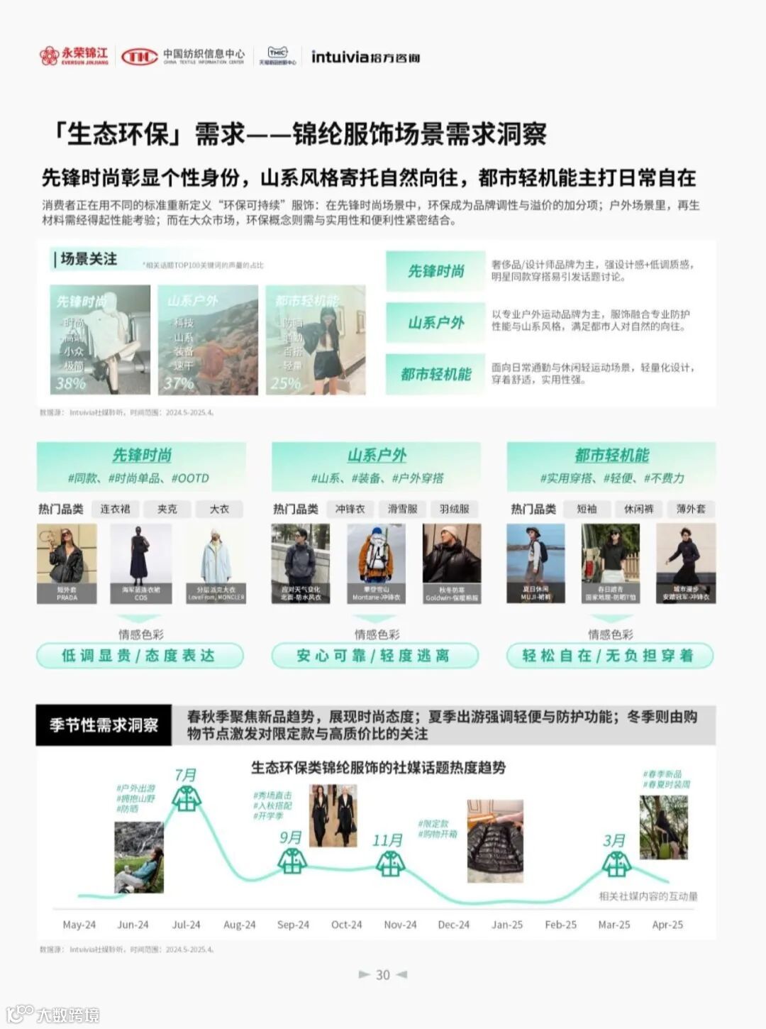 防护衬衫、羽绒服等成熟品类因功能性突出表现稳健;轻量化运动装作为高潜力单品快速增长,契合通勤、休闲及轻运动场景需求;光泽感夹克、裙装等明星产品凭借时尚设计与多场景适配优势引领风格潮流。消费者对环保材质的关注度不断提升,再生锦纶、生物基锦纶等绿色纤维日益受到市场青睐。
