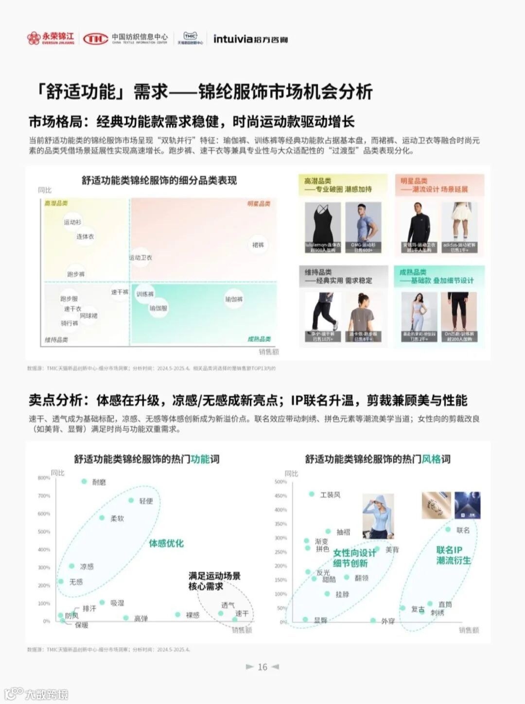 瑜伽裤、训练裤等经典功能款占据基本市场份额,而融合时尚元素的裙裤、运动卫衣等品类因具备多场景适应能力实现快速增长。速干、透气已成为标配功能,凉感、无感体感创新成为新的溢价点。联名设计带动刺绣、拼色等潮流元素流行,女性专属剪裁满足时尚与功能双重诉求。