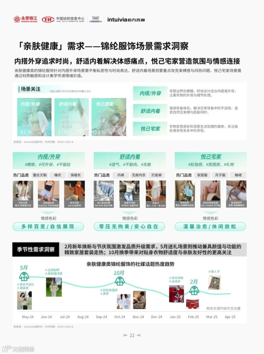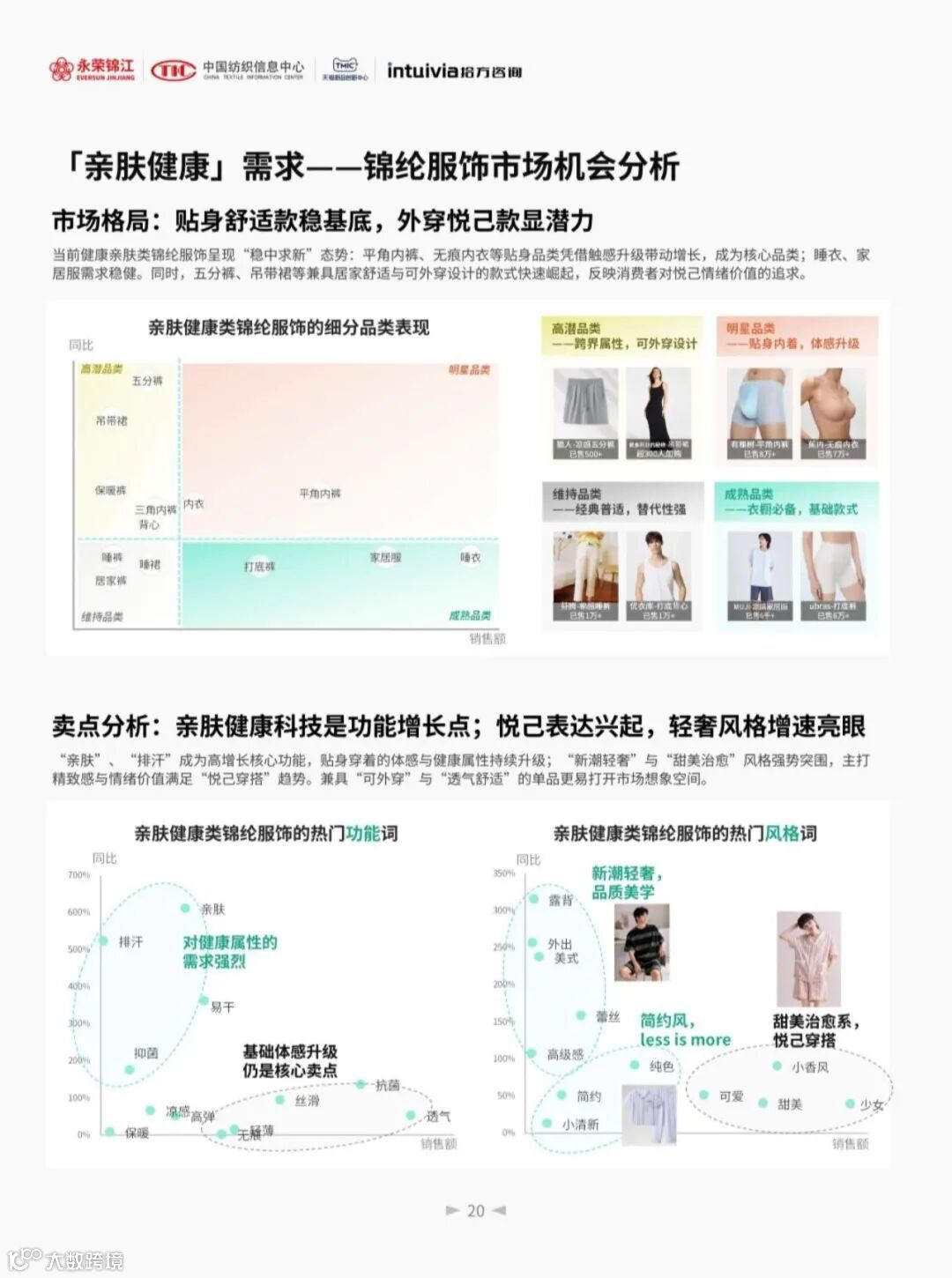 平角内裤、无痕内衣等贴身品类凭借触感升级实现增长,成为核心品类;睡衣、家居服需求保持稳健。兼具居家舒适性与外穿美感的五分裤、吊带裙快速崛起,反映消费者对“悦己”情绪价值的追求。“亲肤”、“排汗”成为高增长关键词,贴身产品的体感体验与健康属性持续升级。“新潮轻奢”与“甜美治愈”风格脱颖而出,主打精致感与情感满足,顺应“悦己穿搭”消费趋势。