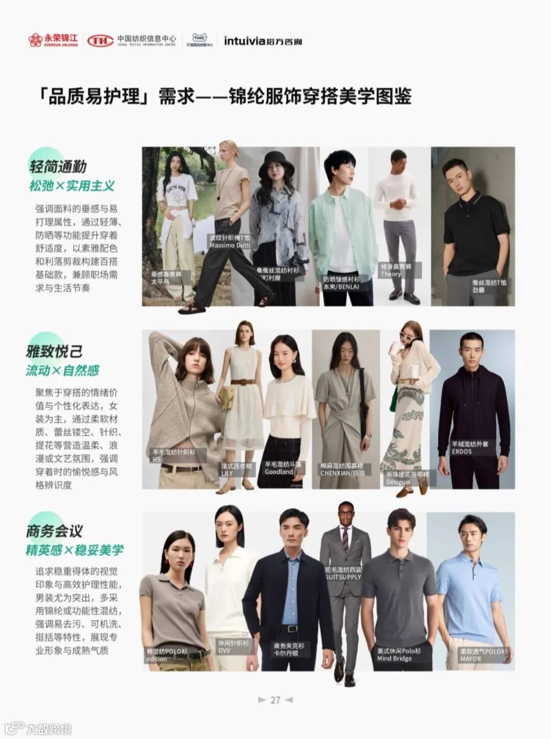 近年来,锦纶通过功能叠加深度渗透日常服饰场景:户外冲锋衣强调防风透湿,内衣注重抗菌处理,商务衬衫突出抗皱性能,休闲裤则强化耐穿特性。“技术+场景”的创新模式正在重塑消费者对功能性服装的认知与穿着需求。
