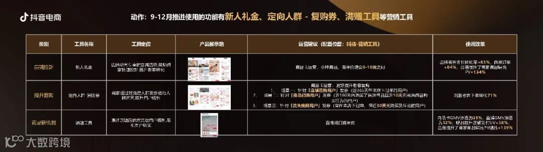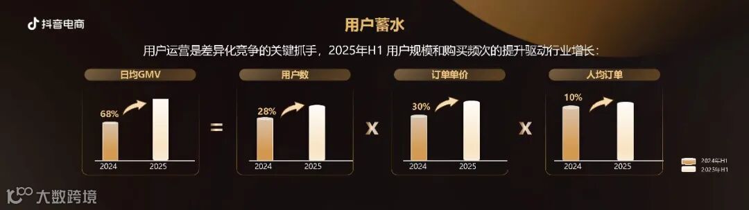 用户规模与购买频次提升是抖音电商增长的主要引擎。数据显示,在日均GMV增长中,用户数量贡献10%,订单单价贡献30%,人均订单增长贡献高达68%。平台建议商家在9月至12月重点使用新人礼金、定向复购券和满赠工具: