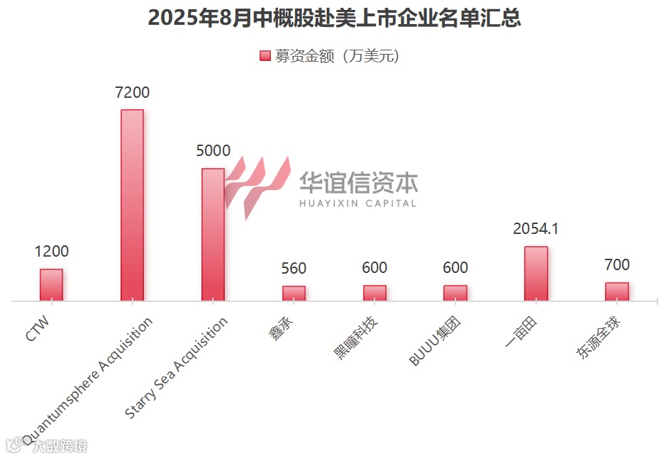 8月中概股赴美IPO募资呈现“头部少、尾部密”特征,无超大型项目。Quantumsphere Acquisition以7200万美元募资额居首,Starry Sea Acquisition、一亩田次之,其余多为百万美元级。表明美股市场对中小型科技、金融企业接纳度高,适配成长期中资企业融资需求。