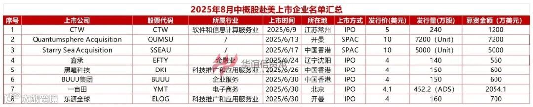 2025年8月,共有8家中企赴美上市,包括6家IPO企业和2家SPAC企业,其中3家来自中国香港。所有企业均在纳斯达克上市,募资总额1.79亿美元。Quantumsphere Acquisition募资额最高,整体呈现中小企业“精准融资”、发行灵活、覆盖多元行业的特点。