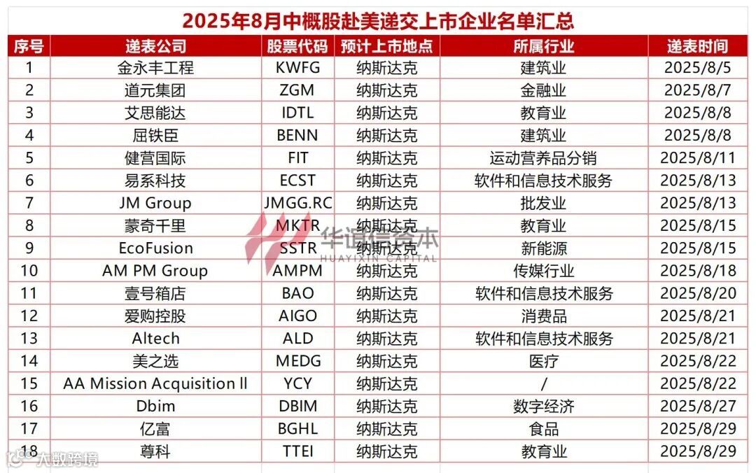 2025年8月,共18家中概股企业向美股递交上市申请,覆盖建筑、金融、教育、新能源、软件信息服务、消费品、医疗等多个领域。多家企业采用SPAC或De-SPAC模式,凸显美股市场制度灵活性对中资企业的持续吸引力。