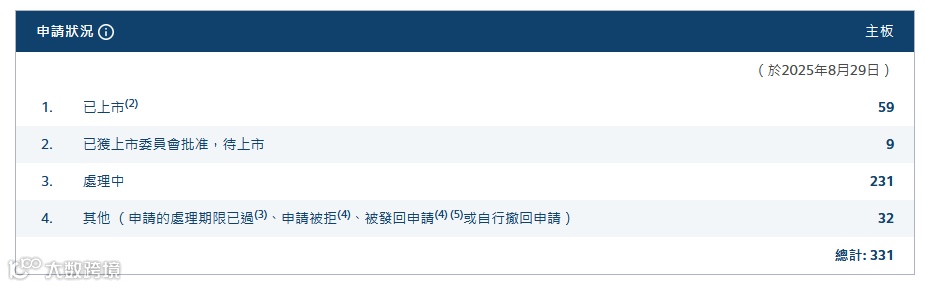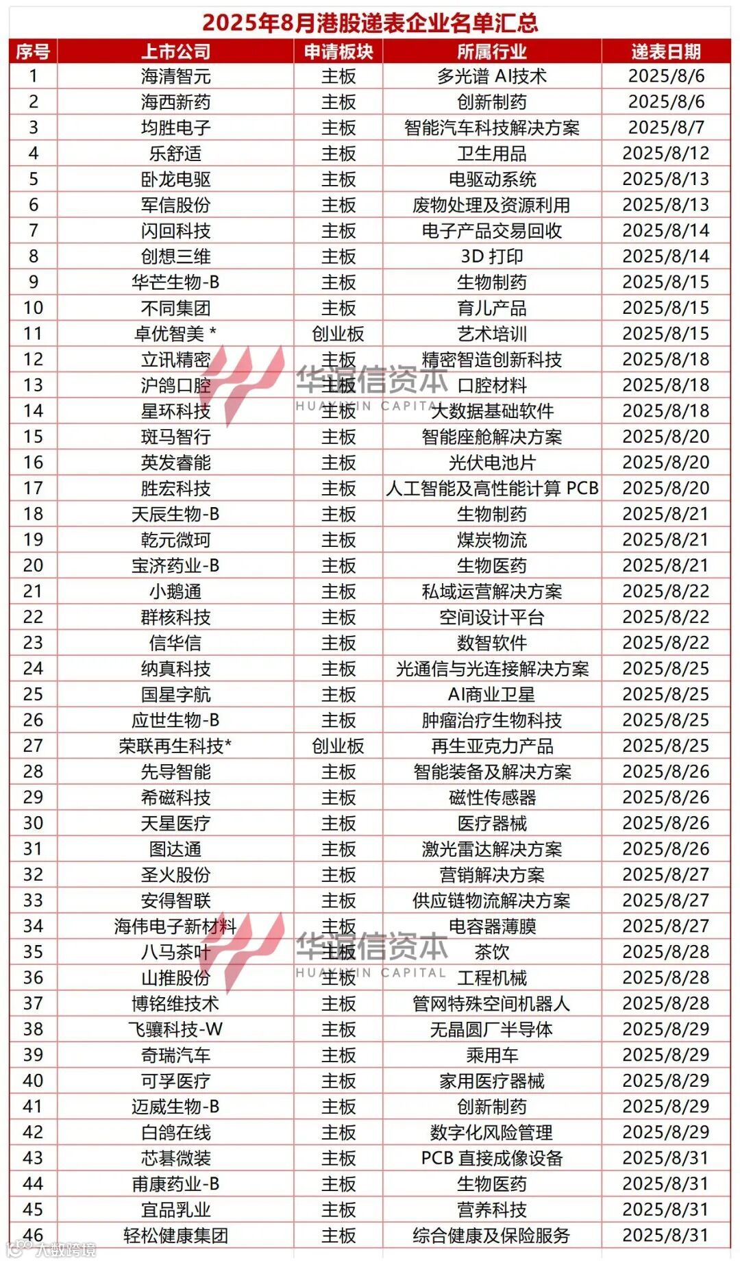 2025年8月,共46家企业递交港股上市申请,其中44家申请主板,2家申请创业板,显示港股对中资企业的吸引力持续增强。行业涵盖硬科技(AI、半导体、智能汽车)、生物医药(含多家未盈利生物科技企业)、消费及传统产业,体现港交所对多元企业的包容性。