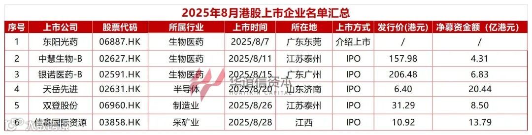 据华谊信资本数据统计,截至8月29日,港股当月共5家企业上市,分别为中慧生物、银诺医药、天岳先进、双登集团和佳鑫国际,总募资额约58.22亿港元。其中生物医药企业占3家,半导体企业天岳先进募资20.44亿港元,为当月最高。江苏泰州有2家企业上市,体现长三角产业集群与资本市场的联动效应。
