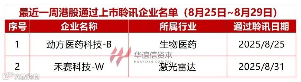 8月25日至29日,共有2家企业通过港交所聆讯:劲方医药科技及禾赛科技。作为全球激光雷达领域领先企业,禾赛科技若成功上市,有望成为港交所“科企专线”首家IPO企业,也被视为中概股回港通道重新开启的重要信号。