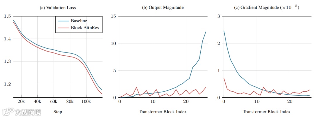 • 图5(b):传统模型的隐藏状态随深度疯狂膨胀(蓝线),而 AttnRes 模型(红线)的数值始终稳定在一个极小的健康区间内,呈现出优美的周期性。 • 图5(c):展示了更均匀的梯度分布,这意味着模型更易训练,不容易崩溃。
