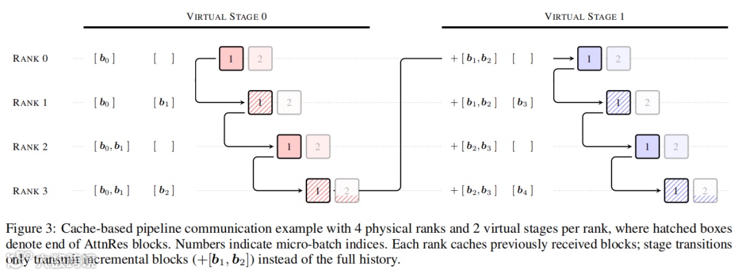 在流水线并行(Pipeline Parallelism)中,每一阶段不再重复发送冗余数据,而是只发送“增量”块并利用本地缓存。