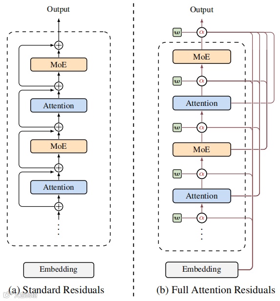 • (a) Standard Residuals:展示了传统的层级累加,权重固定为 1。 • (b) Full Attention Residuals:展示了当前层如何通过一个可学习的“伪查询向量(Pseudo-query)”去动态“点菜”,决定吸收之前哪些层的信息。