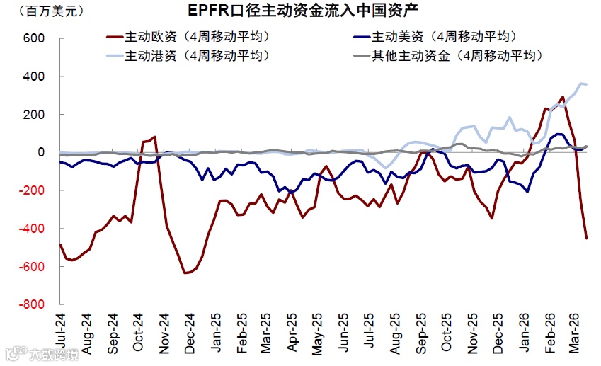 图表:EPFR未观测到外资回流港股迹象,欧洲资金流出规模最大