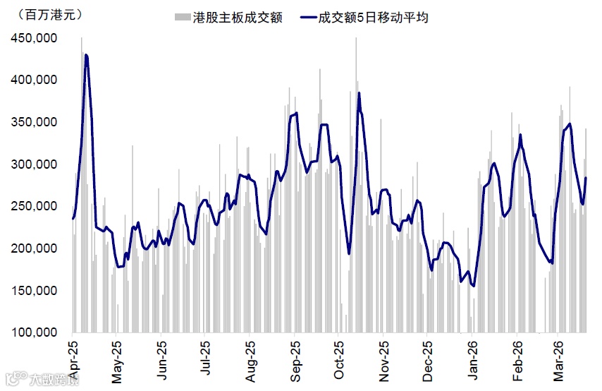 图表:港股与A股市场成交自3月初以来均有所下滑