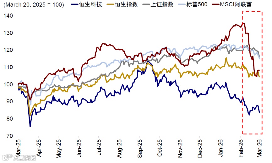 图表:中东局势升级以来,部分国家股市下跌超20%,港股恒生科技指数月初一度反弹