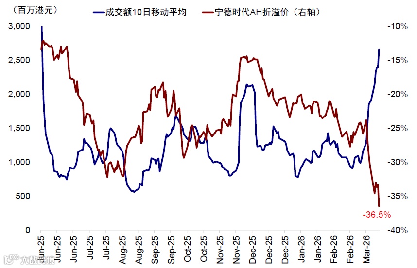 ► 市场成交未显著放大:港股日均成交从3月第一周2513亿港元降至1875亿港元,A股成交同步回落。仅部分标的如宁德时代出现成交放大及AH溢价倒挂加深,显示资金规模不足以影响整体市场。