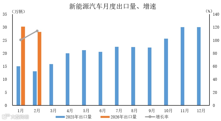 2026 年 1-2 月新能源汽车出口58.3 万辆,同比增110%,占总出口比重达43.1%,接近半壁江山
