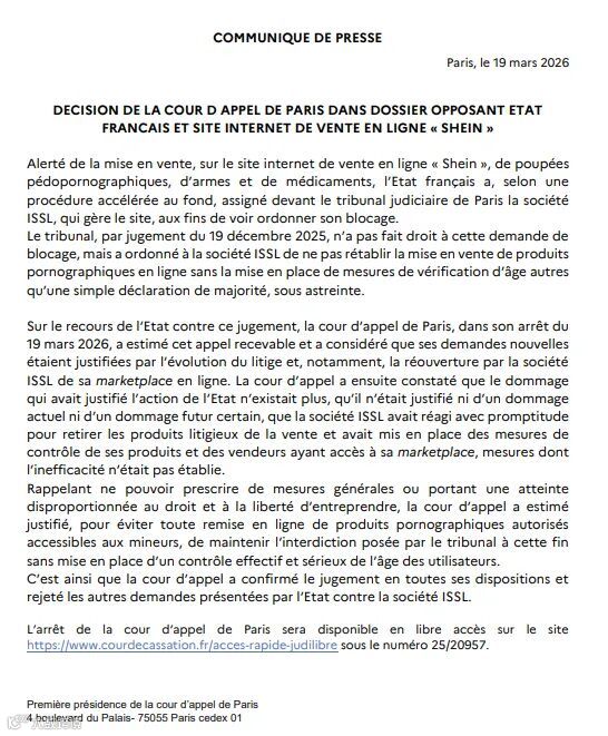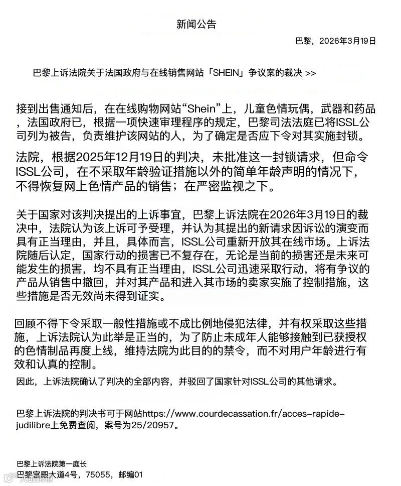 近日,法国巴黎上诉法院作出终审裁决,驳回法国政府对希音(Shein)的全面封锁请求,仅保留未成年人年龄验证要求。此举标志着中国跨境电商在应对欧洲监管压力中取得关键司法胜利。