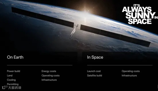 太空算力具备三大优势:太阳能获取效率为地面5倍以上(无大气衰减/昼夜循环)、无需防极端天气的硬件加固、持续日照减少储能需求。当火箭入轨成本降至临界点后,太空AI部署将成为必然选择。