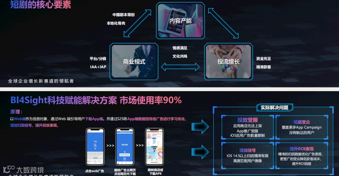 当前短剧出海面临三大挑战:投放受限、iOS归因精准不足及获客成本偏高。企业需借助BI4Sight系统提升投流精准度,深化内容本地化策略,并构建完善的版权保护与商业化全链路体系,稳步推进SMB客户向KA转型。