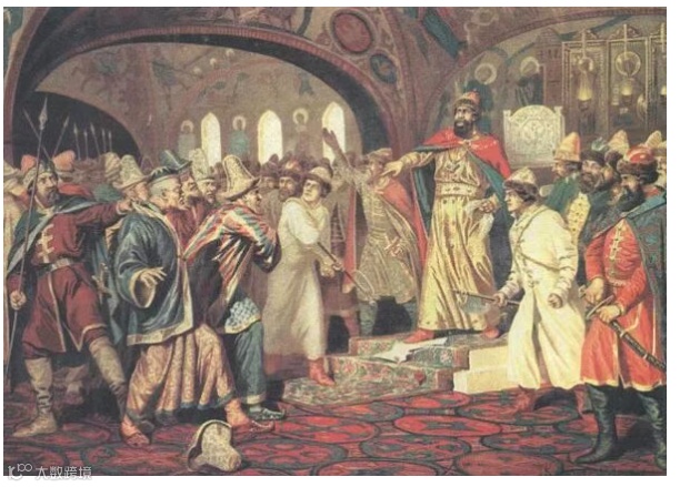 伊凡四世三岁即位时,政权掌握在贵族的手中,莫斯科国家依然混乱不堪。1547年,伊凡四世认为自己是罗马精神的继承者,并且是东正教的最后守护者,于是加冕为沙皇。他开始了一场场大屠杀来铲除大贵族,血洗诺夫哥罗德,甚至把自己的儿子杀死。因为伊凡四世杀人如麻,所以又被称为伊凡雷帝。