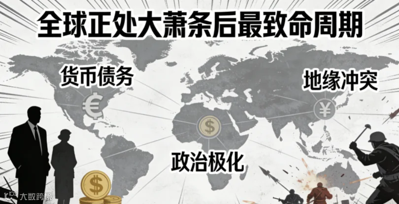全球正处大萧条后最致命周期,货币债务、政治极化、地缘冲突三重风暴共振,旧秩序加速崩塌,新秩序未立,是百年未遇危局,风险复杂度超1930年代大萧条、2008年金融危机。