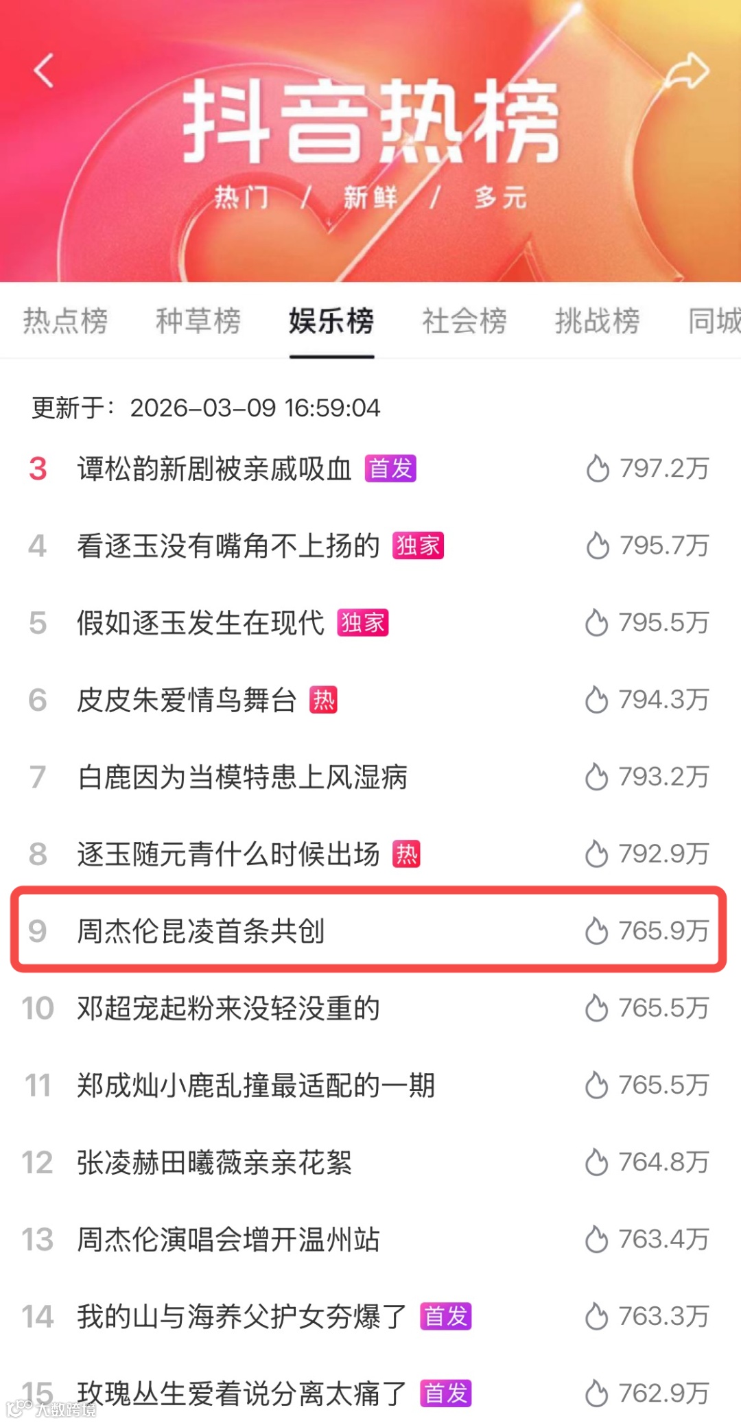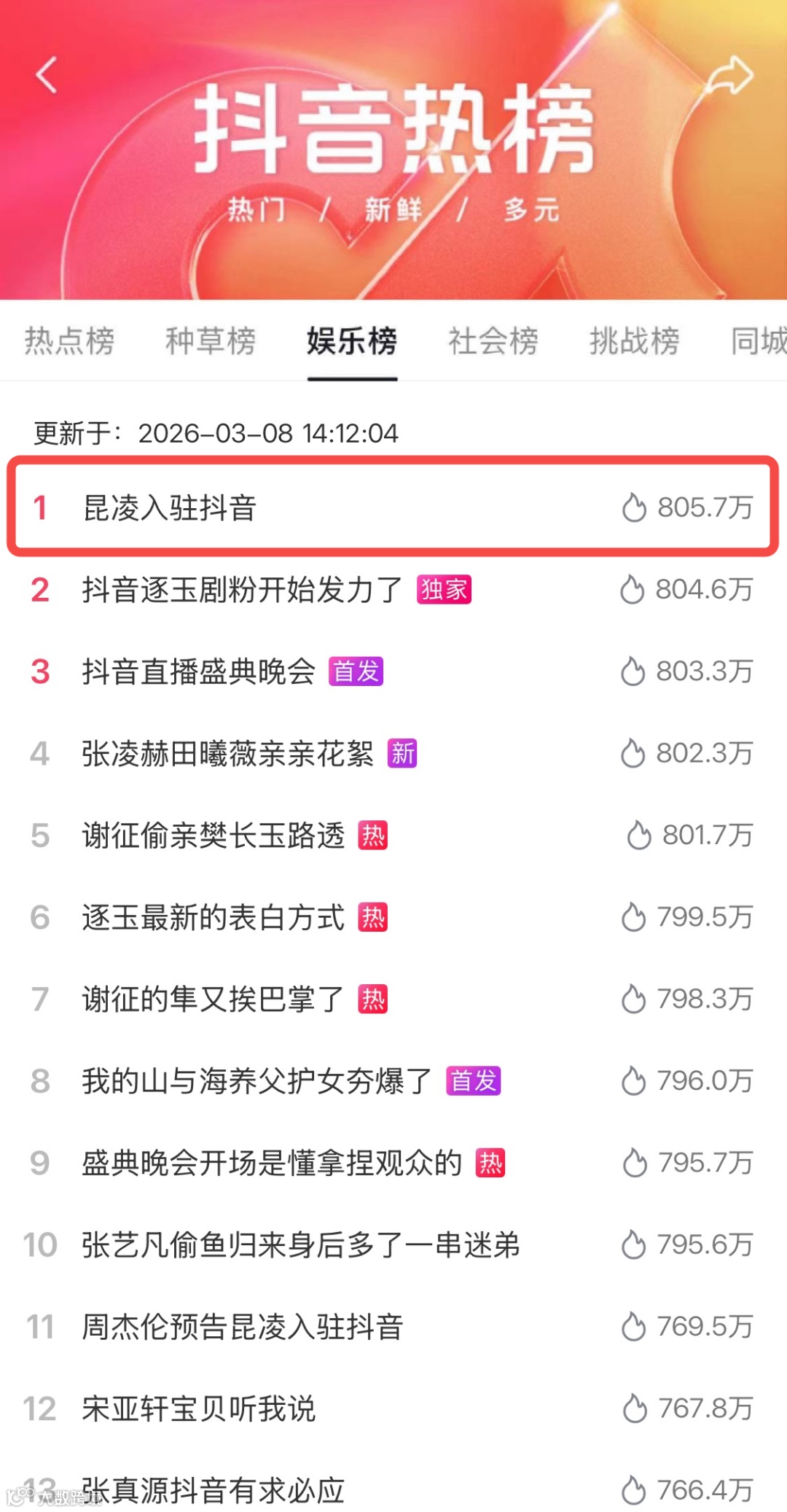 借助周杰伦昆凌夫妇流量势能,策划“昆凌入驻抖音”事件:3月7日预告引发热议,8日入驻登顶娱乐榜,次日双人视频再度引爆。明星真实互动传递“多面女性”理念,实现亿级情感化曝光。