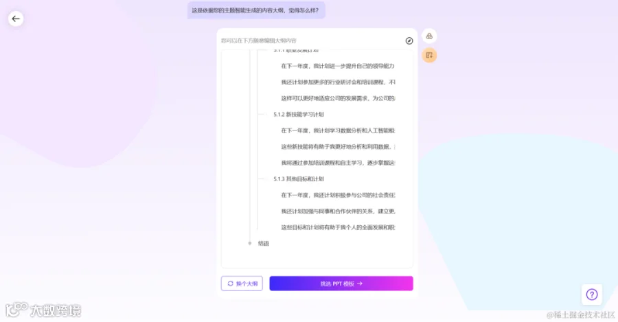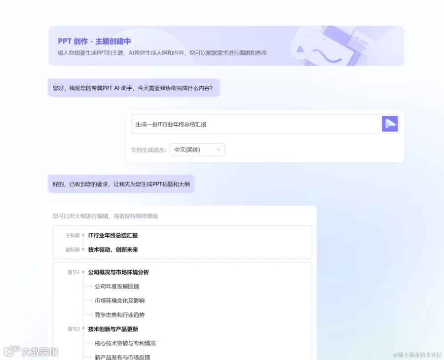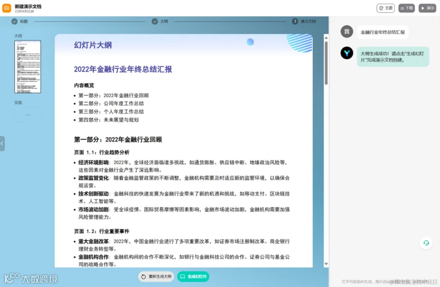 用户输入PPT主题后AI生成详细大纲,支持风格切换,每天可免费生成两次。