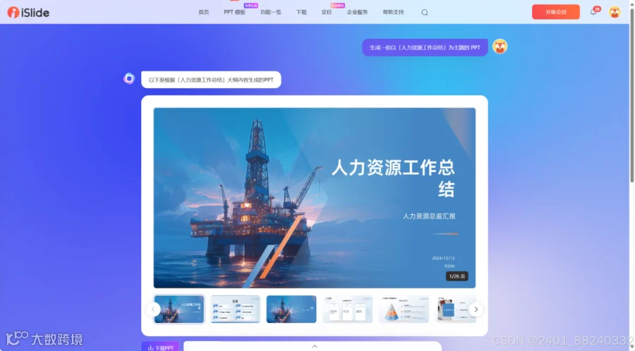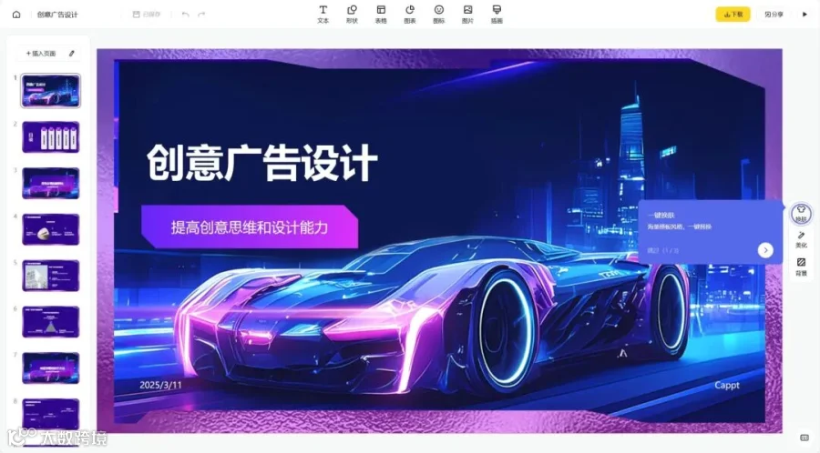 输入一句话自动生PPT,内置海量模板支持在线编辑美化,生成后分享即可免费下载。