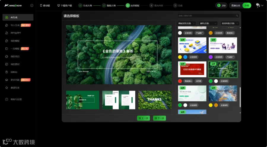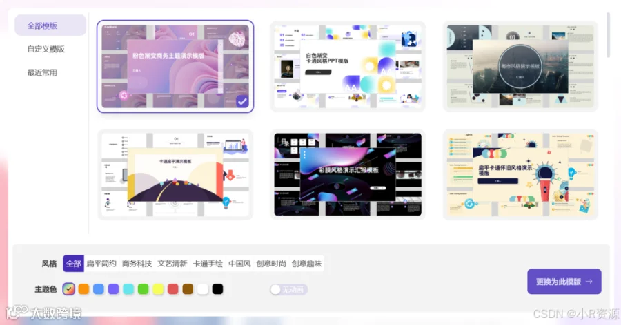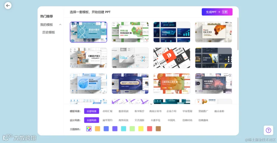 支持免费不限次数生成PPT模板,用户可自定义主题并切换模板风格。