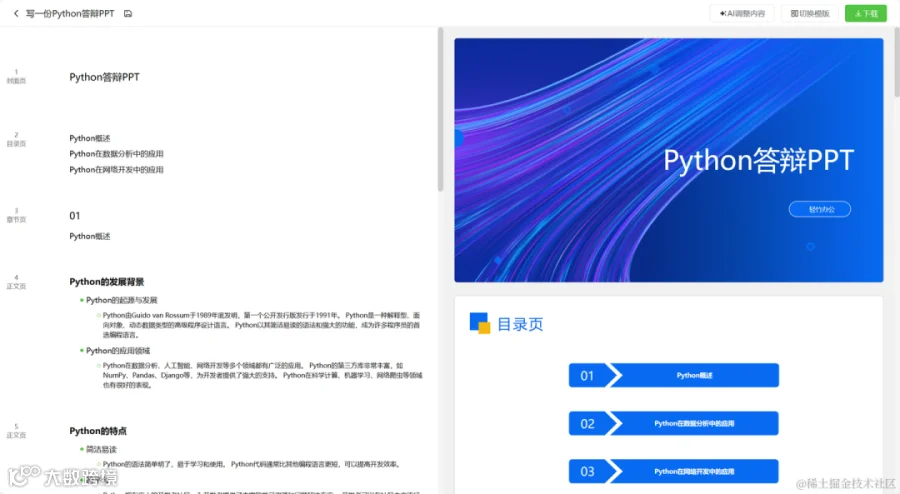 输入标题快速生成大纲及匹配模板,支持免费生成下载PPT。