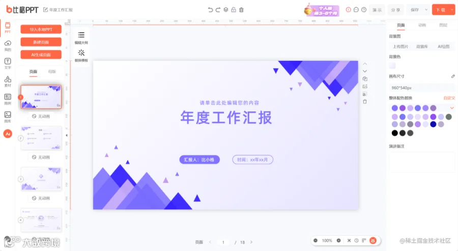 云端PPT设计平台,结合AI技术与海量模板库,提供模板选择、智能排版及团队协作功能,提升设计效率与专业度。