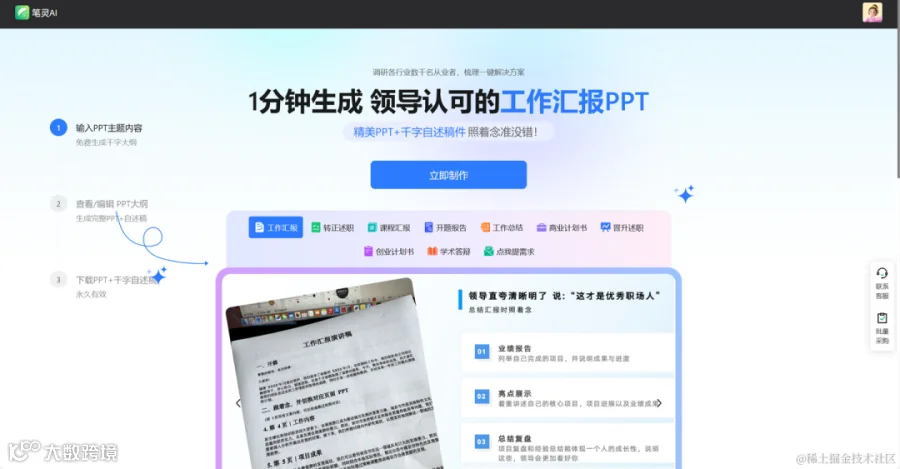 科大讯飞推出的免费PPT工具,支持输入一句话、文档或音视频智能生成文档,并包含在线编辑、美化及演讲稿生成功能。