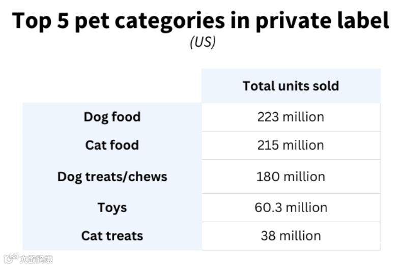 美国自有品牌制造商协会(PLMA)联合科尔西纳统一数据平台的调研显示,从绝对销量来看,宠物食品是自有品牌最大细分品类:该周期内自有品牌狗粮销量达 2.23 亿件,猫粮紧随其后,销量为 2.15 亿件。但二者在对应品类整体销量中的占比仅为 18.3% 和 10%。