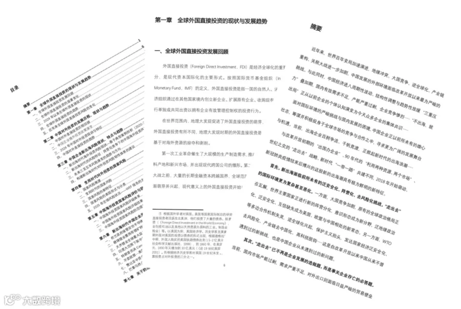 本报告一共八章,十二万余字,第一章分析了全球外国直接投资的现状与发展趋势。基于联合国贸易发展会议、国际货币基金组织等机构有关全球外国直接投资的数据,本章对全球外国直接投资发展历程进行了回顾,分析了近十年来全球外国直接投资的特征、近年全球外国直接投资的现状、趋势,以及全球外国直接投资风险的变化。