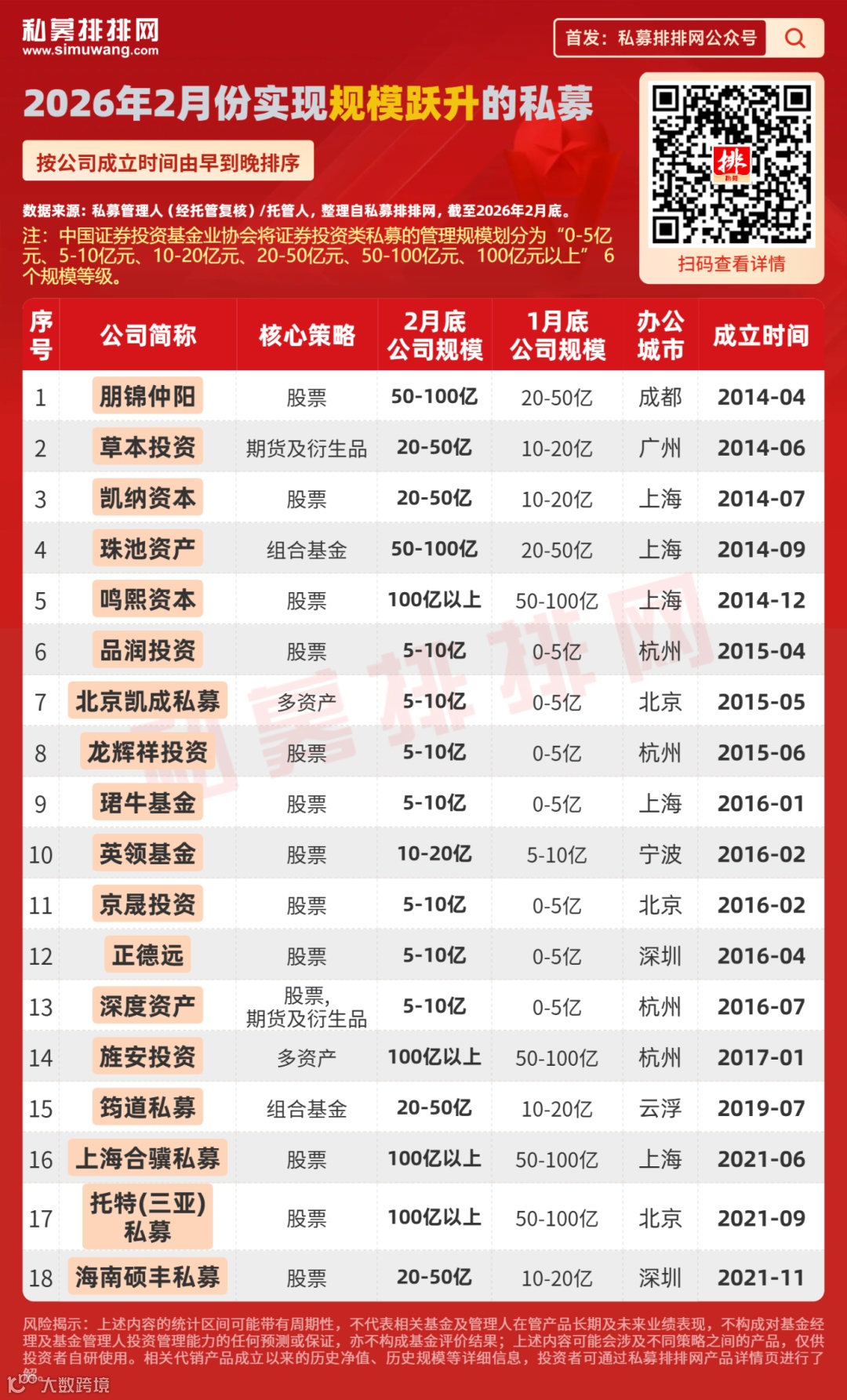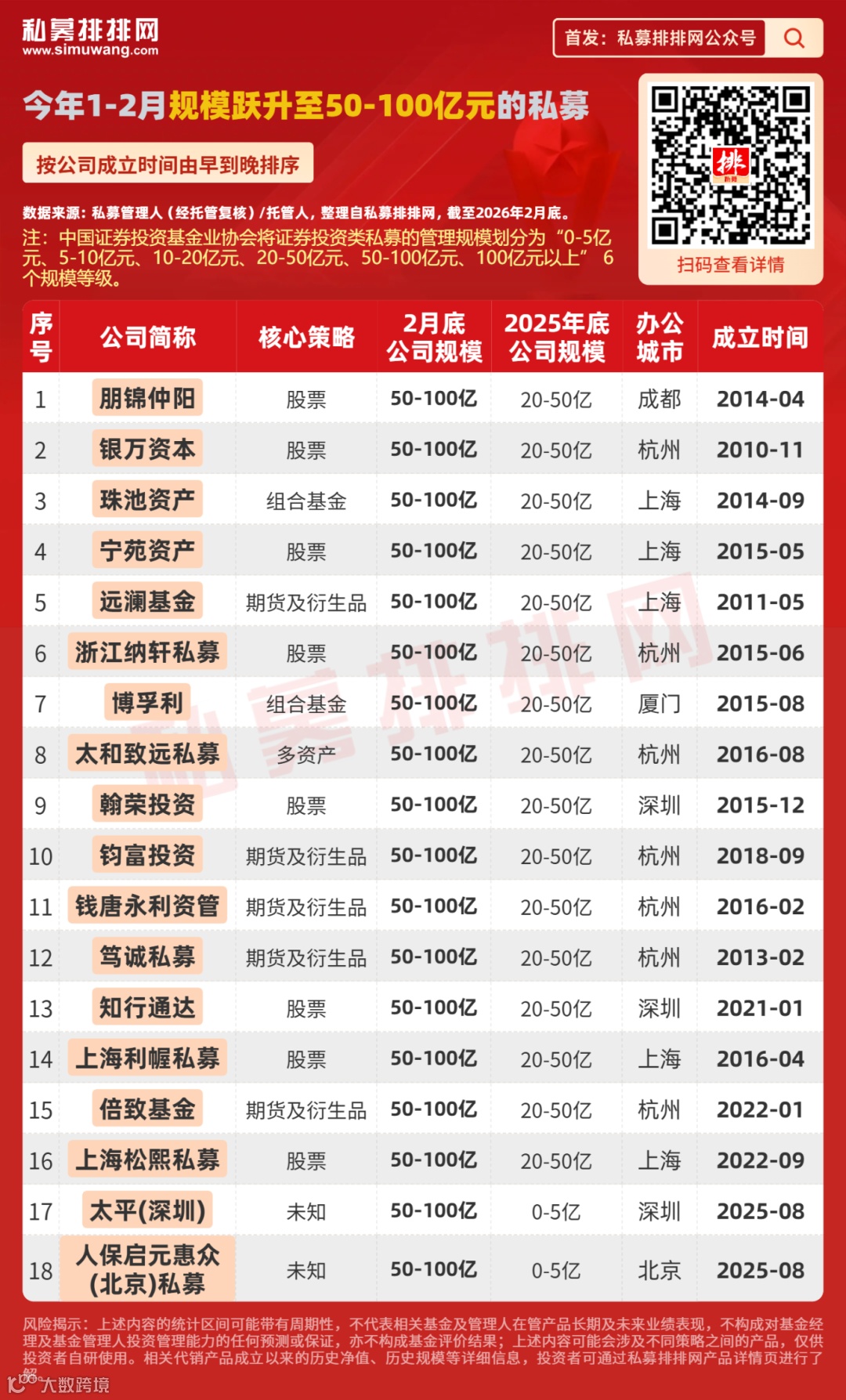 在2026年1-2月份,公司管理规模跃升为50-100亿元的私募共有18家。其中,股票策略私募占8家,期货及衍生品策略私募占5家。