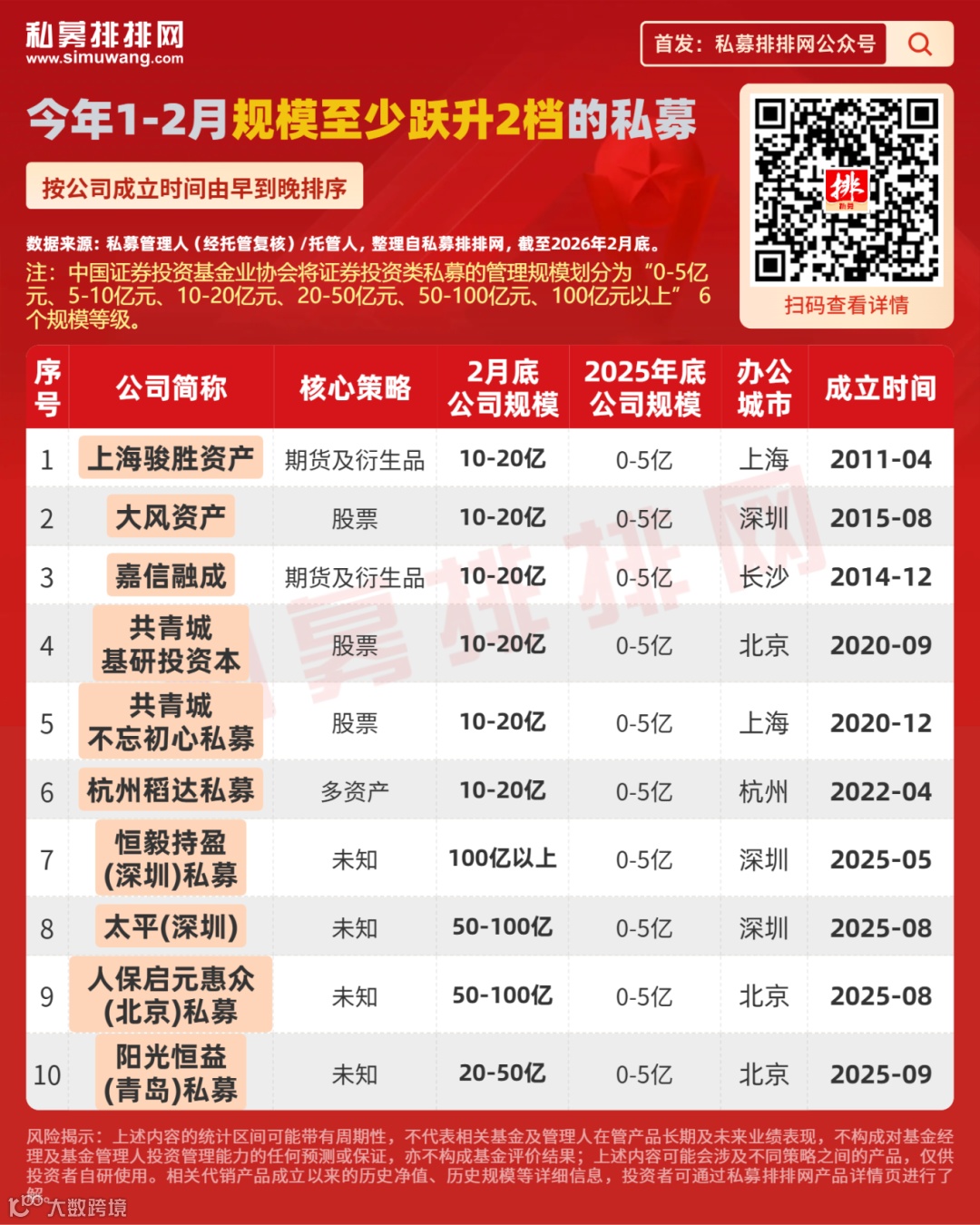此外,经笔者梳理,今年1-2月有10家私募实现了管理规模跃升至少2档。其中,恒毅持盈(深圳)私募、太平(深圳)、人保启元惠众(北京)私募、阳光恒益(青岛)私募是2025年成立的险资系私募。