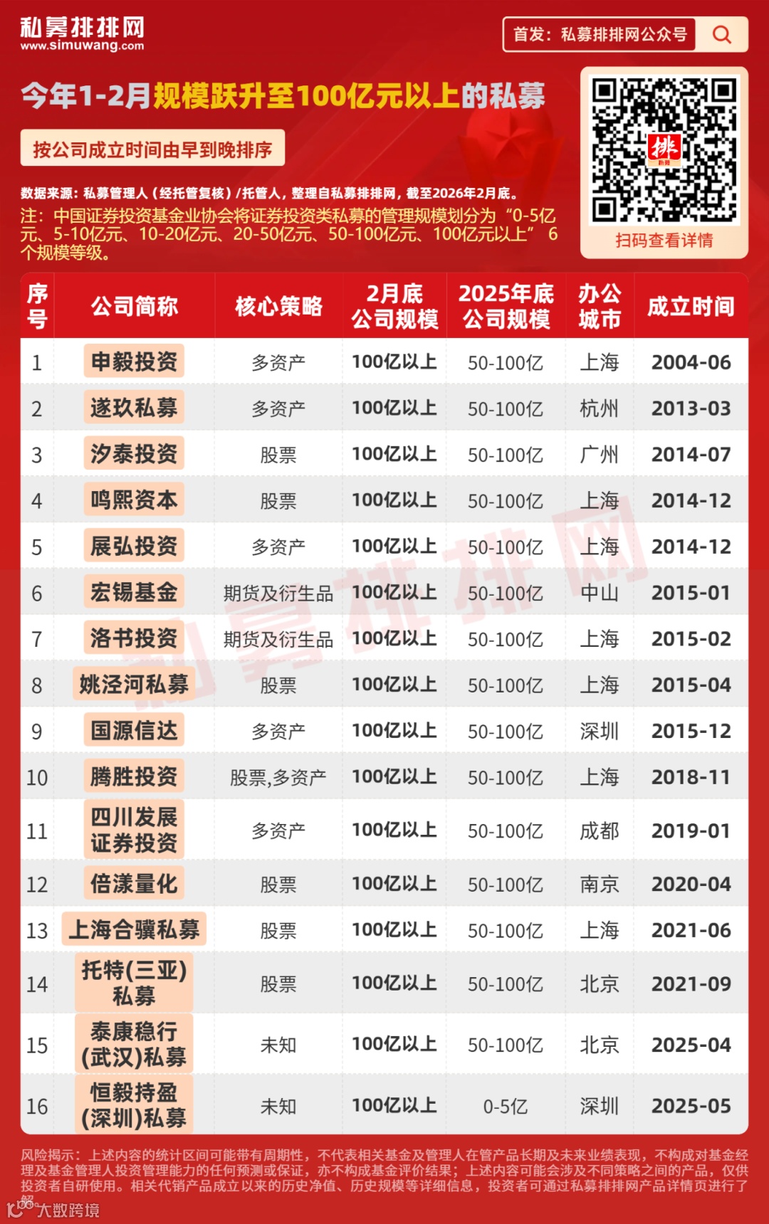 在2026年1-2月份,公司管理规模跃升为100亿元以上的私募共有16家,百亿私募因此扩容至126家,数量再创历史新高。(参考:百亿私募达126家,再创历史新高!3家新晋,1家重回!)