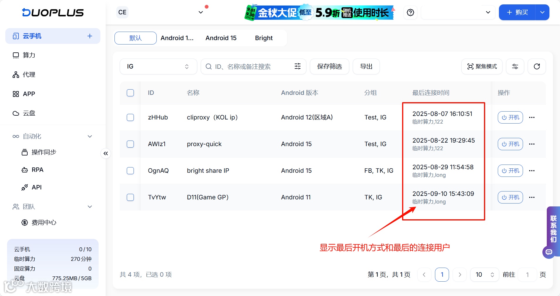 DuoPlus在列表中显示云手机的“最后连接用户”,并在搜索栏添加了【用户】字段,支持通过团队用户名称搜索云手机,在使用过程中可以更方便筛选出对应的云手机,进行批量操作。