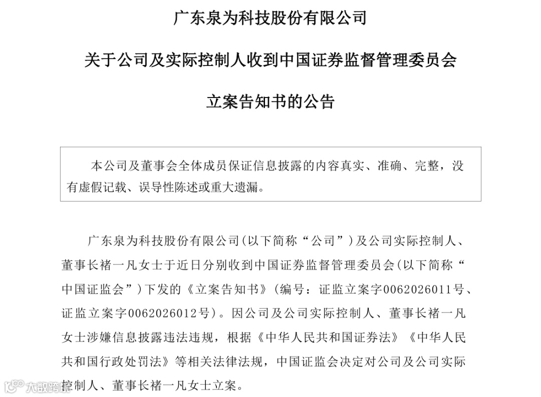 3月19日晚间,广东泉为科技股份有限公司(证券简称:ST泉为,股票代码:300716)发布公告称,因公司及公司实际控制人、董事长褚一凡女士涉嫌信息披露违法违规,根据《中华人民共和国证券法》《中华人民共和国行政处罚法》等相关法律法规,证监会决定对公司及褚一凡女士立案。