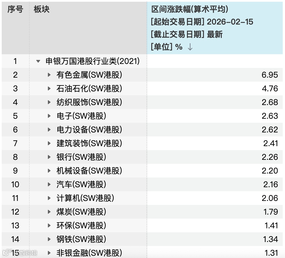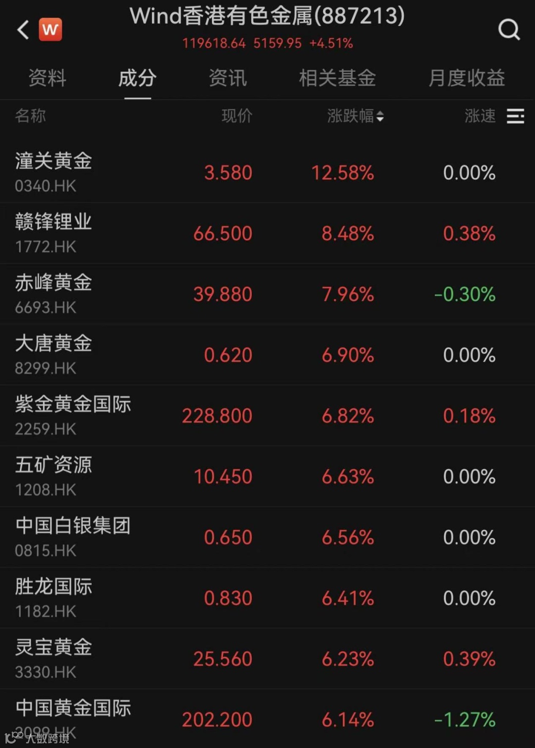 行业板块方面,港股周期资源板块全线回暖,有色金属领涨市场。Wind香港有色金属指数涨4.51%,成分股中,潼关黄金大涨12.58%,赣锋锂业涨超8%,赤峰黄金涨近8%,大唐黄金、紫金黄金国际、五矿资源等涨逾6%。