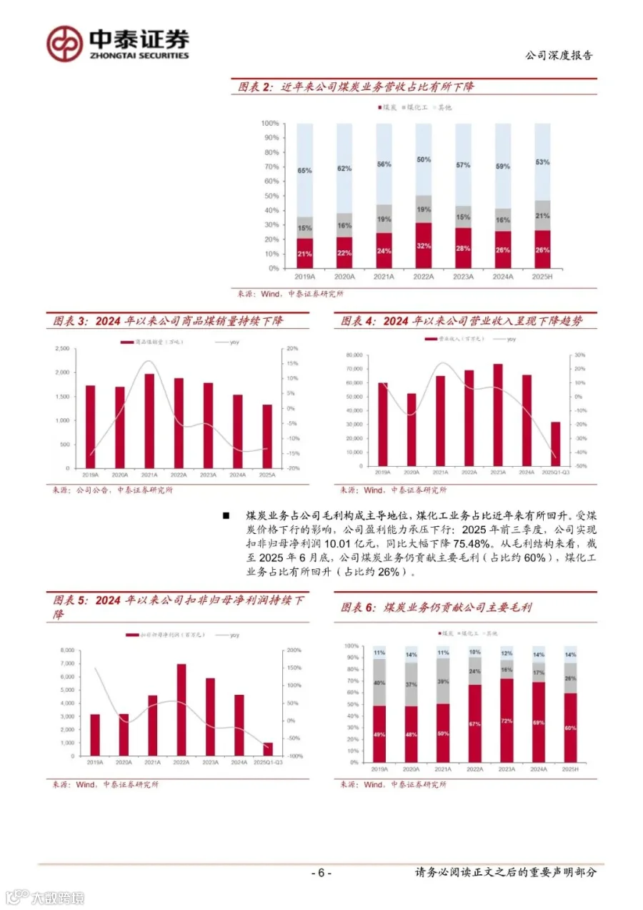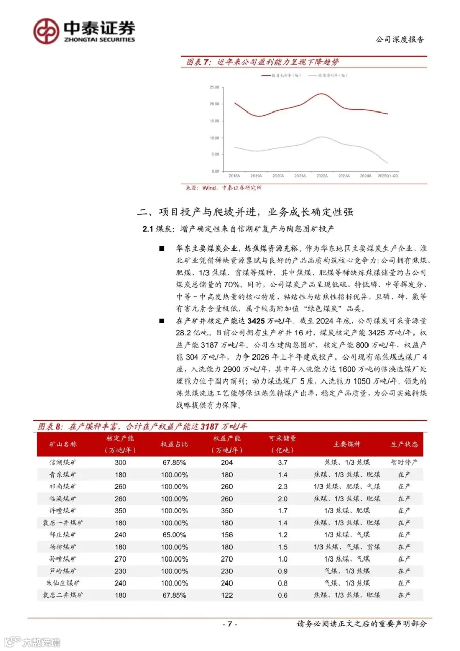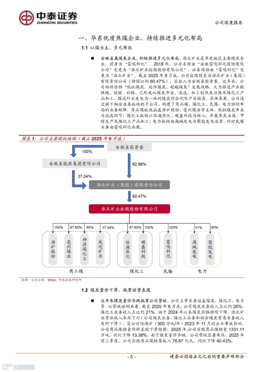 以煤为主、多元布局,华东焦煤龙头企业。淮北矿业是华东地区主要煤炭企业,公司始终坚持“依托煤炭、延伸煤炭、超越煤炭”发展战略,大力推进产业链强链、延链、补链,已形成从煤炭开采、洗选、加工到焦炭冶炼及煤化工产品加工、煤泥矸石发电为一体的煤炭综合利用产业链条。截至 2025 年 9 月底,公司控股股东为淮北矿业(集团)有限责任公司(持股比例 60.47%),实控人为安徽省国资委。煤炭业务仍是公司毛利主要来源:截至 2025 年 6 月底,公司煤炭业务毛利占比约 60%,煤化工业务占比有所回升占比约 26%。
