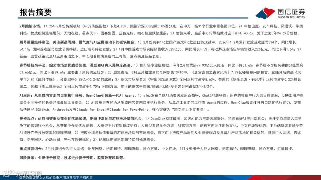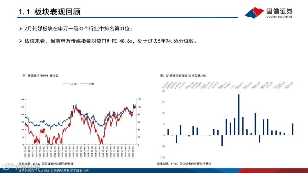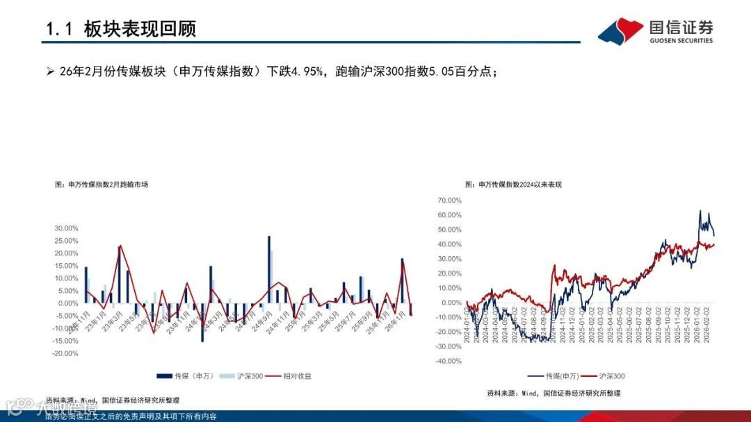 1)26年2月份传媒板块(申万传媒指数)下跌4.95%,跑输沪深300指数5.05百分点,在申万一级31个行业中排名第31位;