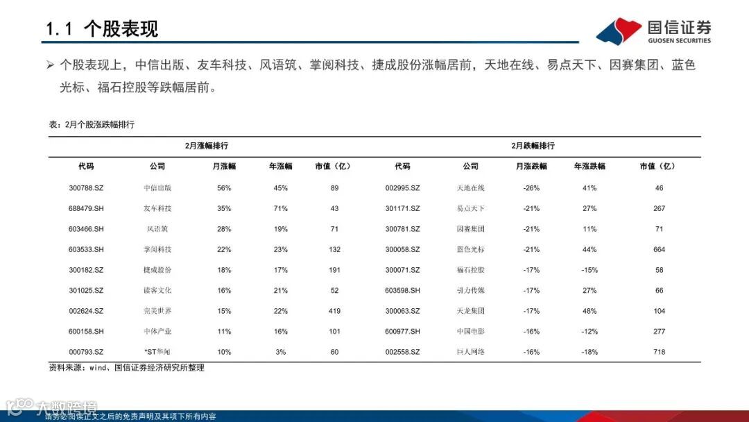 2)中信出版、友车科技、风语筑、掌阅科技、捷成股份涨幅居前,天地在线、易点天下、因赛集团、蓝色光标、福石控股跌幅居前;